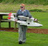 Four Speed 600 (Mabuchi 550) can motors wired series-parallel, with 3.5:1 Master Airscrew reduction gearboxes, turn 10x6 four blade props at 6,500 RPM. Static thrust is 110 ounces at 32 amps (16 amps to each motor). Selig 7055 airfoil with NACA leading edge cuff on outboard sections. Slotted flaps. Wing built in three sections. The nose section of the fuselage is removable to give access to the battery and make adjustments to the nose wheel mounting, as well as reducing the size of the fuselage for transportation. The tail plane and main landing gear are also removable. August 2007.
