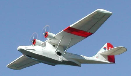 A smaller version of the PBY-5 listed below. Uses two GWS Speed 400 geared motors running parallel from an 8-cell battery. Flies 27 min on eight cell 3000 NiMH. Built 2004. |