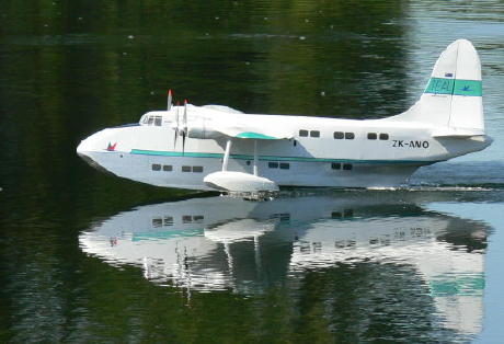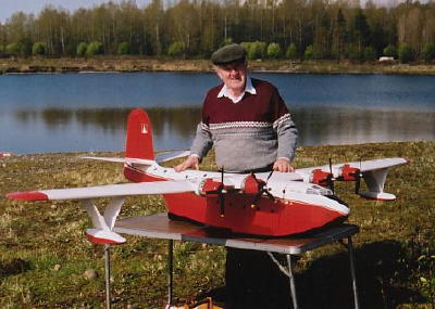 A larger version of Short Solent 400 above. Four Permax 480 motors wired parallel. MP-Jet Speed 400 gearboxes with 4.1:1 reduction drive 10x7 four blade props. Static current is 38 amps giving thrust of 60 ounces at 4,600 RPM. Selig 7055 airfoil with NACA leading edge cuff on outboard sections. Flies on 10 to 12 nicads (3S or 4S LiPo cells). Ivan's all time favourite flying boat. August 2006.