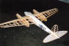 Eppler 197 airfoil with NACA leading edge cuff outboard. Three section wing for ease of transportation. Sturdy fixed undercarriage is good for rough grass strips. Slotted flaps to Andy Lenon formulae are very effective. Prototype is powered by Kyosho 17-turn Atomic Force car motors driving four-blade 15x10 Zinger wood props through 7.2:1 ratio super box. Built 2000. |
