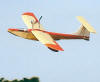 Four Jamara 480 HS BB motors are used, wired series-parallel, driving 10x7 APC-E props through 4.1:1 ratio gearboxes. Static Thrust is 76 ounces at 6,200 RPM drawing 26 amps from the battery. (13 amps each motor.) The wings have a very high aspect ratio. Efficiency comes from using the thin Selig 3021 airfoil, modified towards the tips, but as in sailplanes, it makes for a challenge in accurate construction. Removable outer wing panels are optional, but demand good workmanship because of the thin airfoil used. Likewise, the undercarriage is a tight fit in the fairings, but they add to the streamlining of the model. The torsion bar suspension used on the main gear gives very good operation on rough fields. Flight characteristics are excellent. A safe, easy to fly model. August 2008.