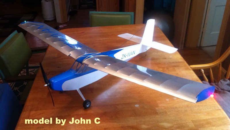 A slightly smaller version of Ivan's earlier Seagull design. Plan shows both a 48-inch span with square tips, as well as optional, and easily added, curved tip extensions that stretch span to 53 inches. Park 300 or equivalent motor with 8x4 or 8x6 prop and 3S 1300mAh LiPo Battery. August 2015.